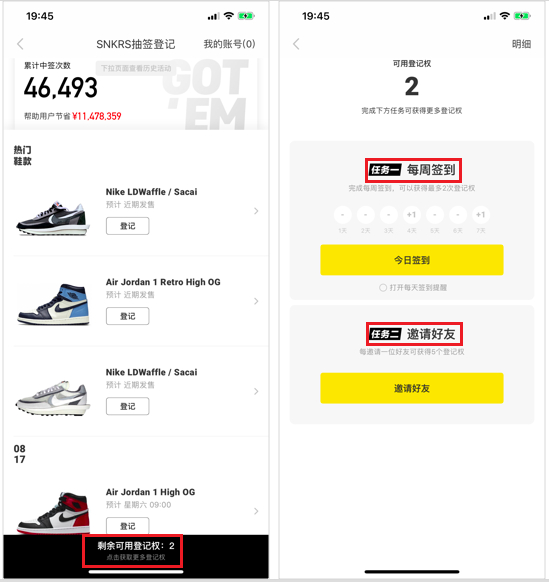 但是,玩家小张表示,这个功能还是作用不大,更像是平台的一个硬广。因为每人每次可用的登记次数为两次,获取更多登记权则需要通过“每日签到”和“邀请好友”,只是平台留存和拉新的手段罢了。