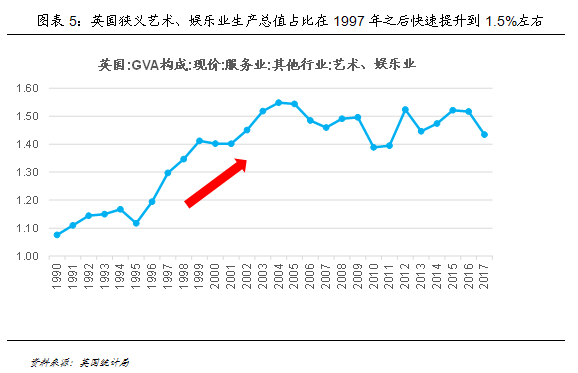 1997年英国新工党首相布莱尔上台后,将“国家遗产部”更名为“文化、媒体和体育部”,积极推动成立“创意产业特别工作小组”,并自己担任主席一职,该工作小组在1998年和2001年两次发布研究报告,分析英国创意产业的现状并对全国文化艺术产业的未来发展做出规划,伦敦更是将创意作为核心产业发展。在政策的高度支持下,英国艺术、娱乐业在生产总值(GVA)中的占比在1997年之后快速提升到1.5%左右,需要注意的是这是狭义文化产业的概念。