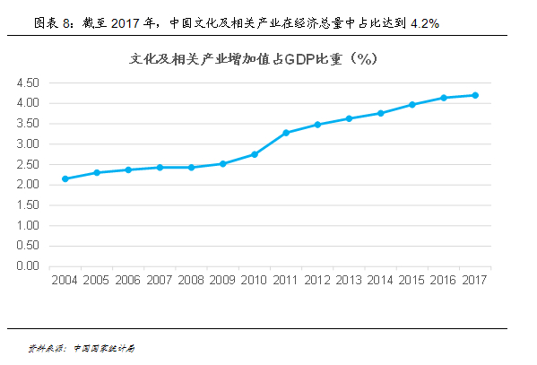虽然中国整体经济增长中枢在稳步下行,但文化及相关产业增速却仍然保持平稳,并显著高于整体经济增长水平。根据国家统计局数据,截至2017年,中国文化及相关产业增加值维持在13%左右的平稳高增长状态,而同期中国实际GDP的增速已经回落到6.7%,增速的此消彼长带动文化产业在经济总量中的占比不断提升,截至2017年,文化相关产业增加值占GDP的比重已经从2010年的2.75%提升到4.20%,已经逐步成为中国经济的重要引擎。