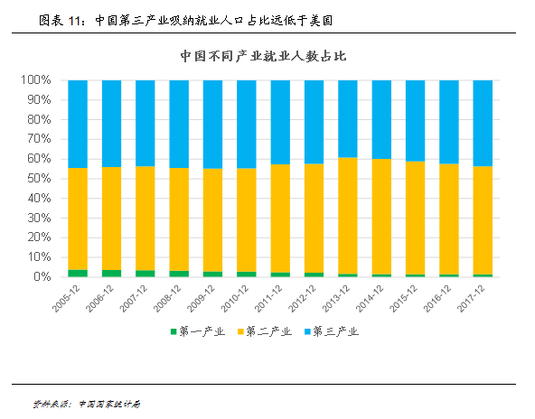 从长期视角看,中国的劳动力就业结构仍然处于变革的早期。从美国等发达市场经验看,随着产业结构的迁移,以服务业为主第三产业吸纳了越来越多的就业人口,其中不少来自于第二产业的转移,美国第三产业就业人口占比从上世纪80年代初的65.7%一直提升到2009~2010年之后的接近80%。