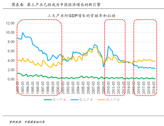 - 2013年之后,随着城镇化和工业化的逐步完成,第二产业增长“哑火”,而第三产业对于经济增长的贡献率逐年提升。截至2019年上半年,第三产业对实际GDP的增长贡献率为3.8个百分点,超出第二产业1.5个百分点。