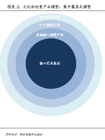 根据联合国教科文组织于2013年发布的《创意经济报告》,具备广义内涵的文化创意产业整体结构呈现集中圈层式分布,主要包括: