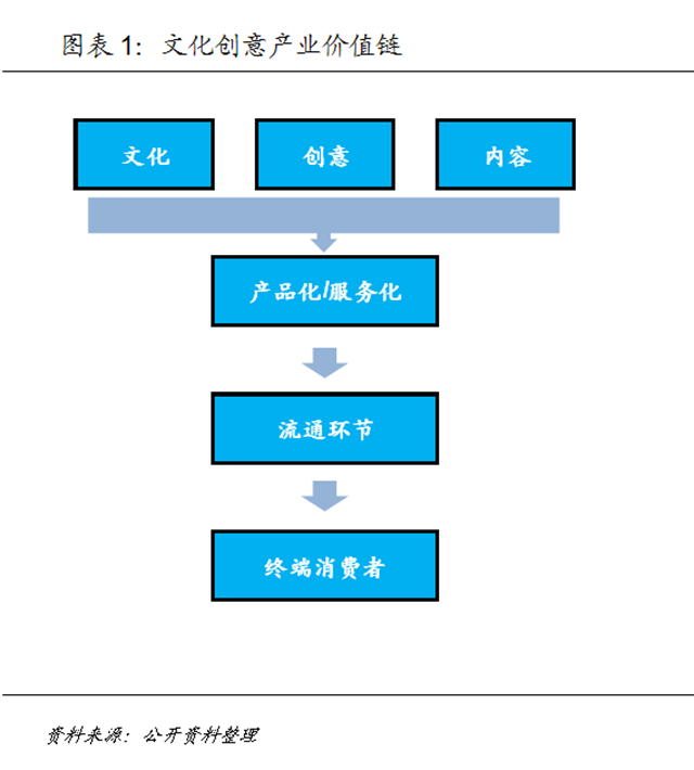 文化创意产业是一条以文化、创意、内容为源头,通过产品化和服务化的形式,通过批发零售渠道的流动和分发,最终传递给终端消费者,实现经济增加值创造的产业化路径。文创产业概念内涵丰富,囊括了内容创意的生产、商品制造、流通、服务等多个环节。在中国,文化服务业是泛文化产业增长的核心驱动力。