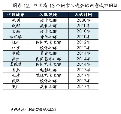 载体的变革能够助中国一臂之力,但更加重要的是,中国悠久的历史和文化积淀提供了文化创意产业发展最重要的沃土。联合国教科文组织在全球选择了重要的文化城市,发起建立“全球创意城市网络”,截至2017年已经有来自72个国家和地区的180个城市入选,其中中国拥有13个,更加重要的是,这13个城市囊括了包括美食、音乐设计、电影、媒体艺术、民间艺术等多个门类,这些创意城市未来都具备建设文化创意产业的基础。