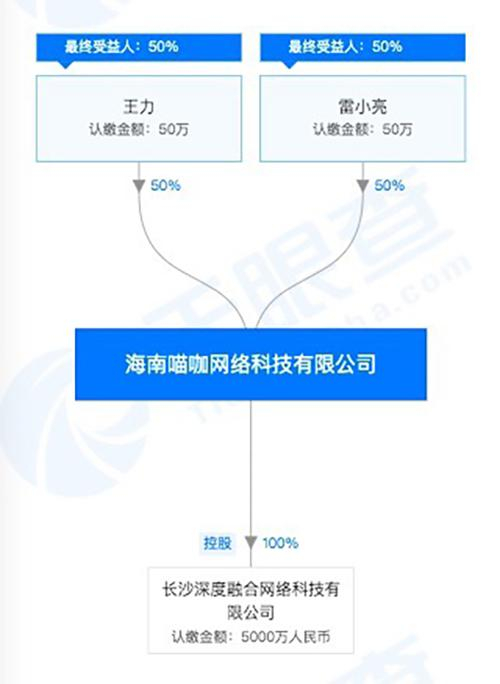 天眼查资料显示,长沙深度融合于2017年9月注册成立,注册资本为5000万元,是海南喵咖网络科技有限公司(海南喵咖)的全资子公司。而王力和雷小亮各持海南猫咖50%的股份。王力为陌陌公司董事、总裁及COO,雷小亮则为陌陌公司联合创始人兼游戏业务部总裁。
