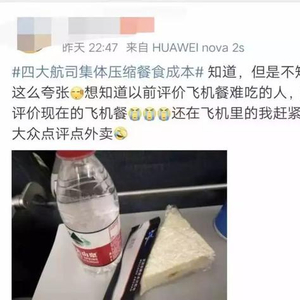 飞机餐缩水最近成为热议话题,许多网友突然发现,原来的正餐变成了点心、水果、零食,而原来的点心则成功“瘦身”为:一瓶水!
