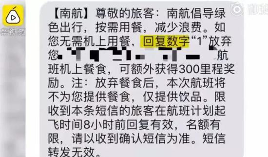 近日,有乘客在预定机票后,收到了南航发来的短信,上面写着取消餐食可获得额外里程奖励。