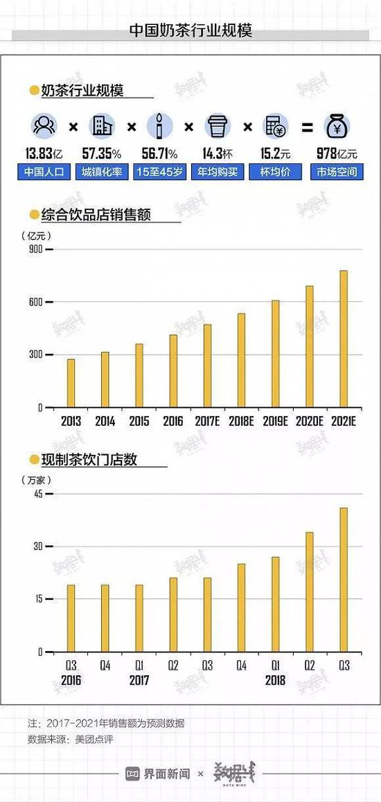 根据美团点评估算,中国奶茶行业规模接近千亿。2017年,国内综合饮品店销售额达472亿元,预计2021年达到779亿元。