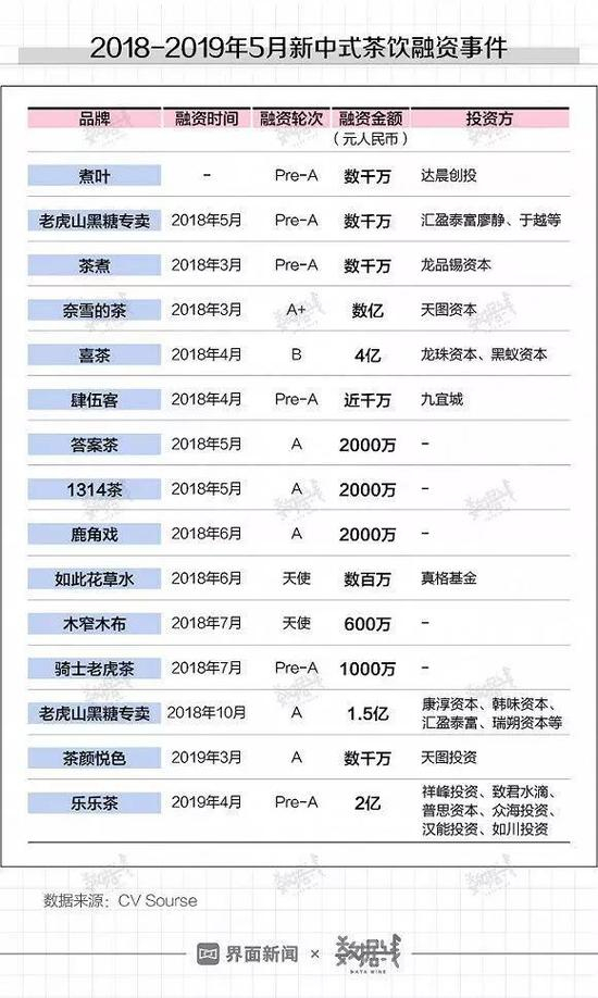 CV Sourse数据显示,从2018年到2019年5月,新中式茶饮的融资事件至少有15起,且数额普遍偏大。头部的新中式茶饮标的成了各家消费类投资机构争抢的阵地。