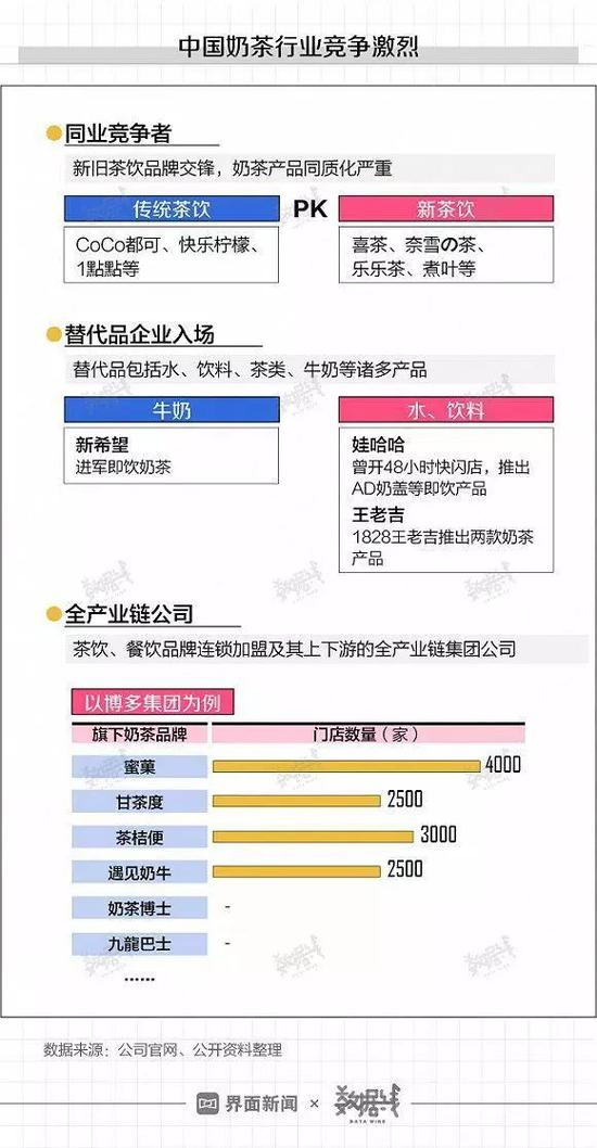 新希望、娃哈哈、王老吉等也争相做起奶茶。此外,一些全产业链公司更是隐藏boss。例如博多集团旗下拥有十几个茶饮品牌,上万家茶饮门店,除了茶饮还经营众多餐饮品牌。