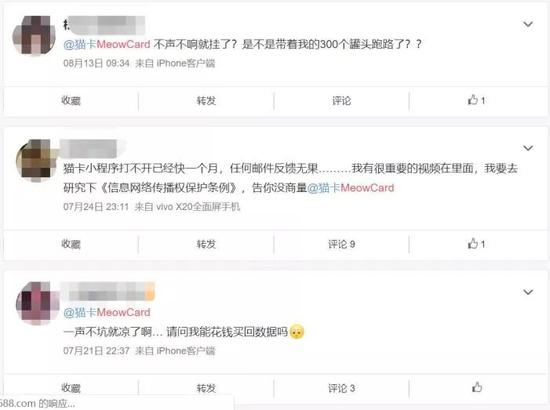 果不其然,在微博上,有网友就声称,家中两只猫的病历、体重、驱虫等信息都记录在猫卡上,并在其官方微博下喊话:“你们千万不要崩啊!求求你们出来给个说法吧!”在论坛平台上,也能发现爱猫人对猫卡“说凉就凉”的指责,以及对其停运前没有通知、导致数据丢失的愤怒,还有为与猫卡上萌猫的“失联”感到不舍。