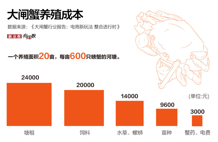 一个养殖面积20亩,每亩600只螃蟹的河塘,养殖总成本能达到7.06万,包括将近2万5千元要用来付鱼塘的租金,2万元用来购买饲料,将近1万元的苗种成本等。这些成本,最终都会体现在螃蟹的“身价”上。