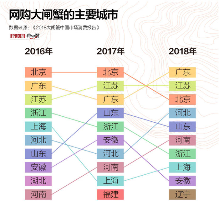 2016年到2018年,广东、江苏、北京三地都是最爱网购大闸蟹的城市。河北、山东、河南、浙江、上海、安徽等地也是重要买家,2018年辽宁也首次闯入榜单。可以发现,网购大闸蟹的习惯虽然横跨南北,但还仅仅停留在东部沿海地带,中西部地区还没有形成这样的消费习惯。