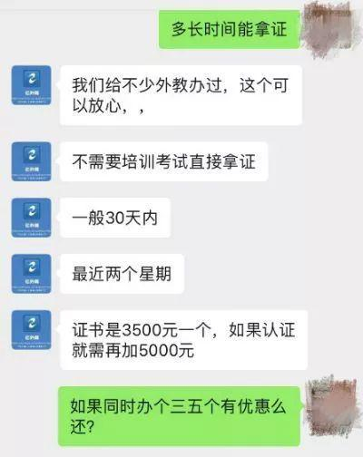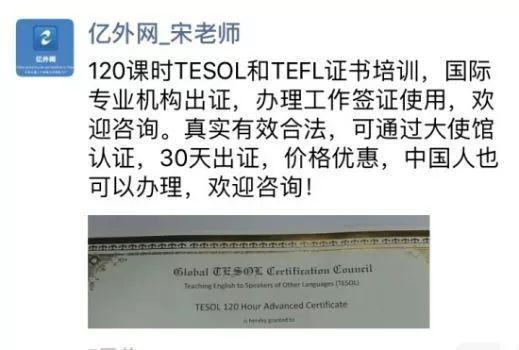 北京商报记者发现,外教招聘中介亿外网,在微信朋友圈赫然发出了“120课时TESOL和TEFL证书培训,国际专业机构出证,办理工作签证使用,30天出证,价格优惠,中国人也可办理”的信息。记者以双语幼儿园从业者身份进行咨询,亿外网告知:“只需要提供外教姓名和护照号,不需要学历证书,外教不需要参与培训,一般30天内,最短两个星期可以拿证。价格上,3500元一个,如果办5个,可以优惠到3000元一个。”