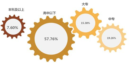 高中以下占比达到57.76%;中专生、大专生次之,占比分别19.26%、15.38%,解决了大量就业问题。