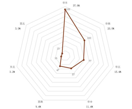 从区域分布情况看,华东区域500强企业188家,占比37.6%,分布数量最多;其次华南区域,企业数量100家,占比20.0%;华北区域,企业数量77家,占比15.4%;华中和西南区域500强企业分别为57家和47家,分别占比11.4%和9.4%。