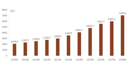 2018年,全国物业管理行业总收入7043.63亿元,比2017年增加1036.4亿元,增长17.25%。随着物业管理行业规模的不断扩大、经营业态的不断丰富,物业管理行业的营业收入同步增加。