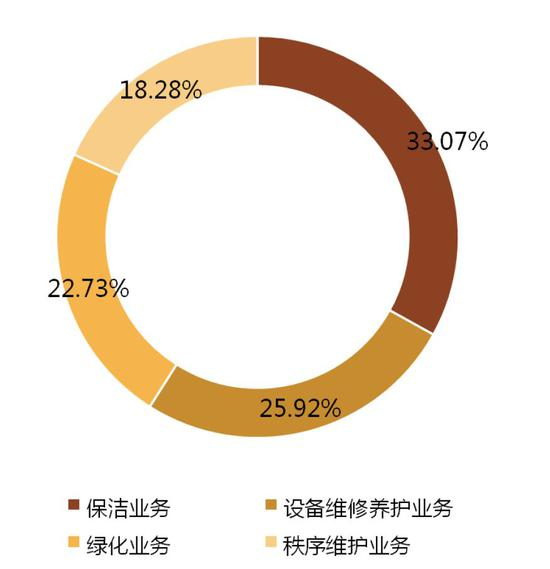 分岗位来看,保洁业务外包项目人员投入占比最高,达到53.74%,秩序维护业务、设备维护养护业务及绿化业务外包人员投入分别占比28.09%、9.11%和9.06%。基础物业服务的外包,将推动企业人员结构的优化和调整。