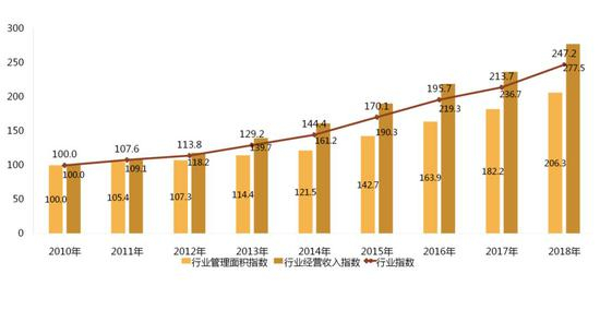 以2010年指数基期值为100点,2018年物业管理行业发展指数达到247.2点,相比2010年提高147.2个点,指数复合增长率11.98%,物业管理行业发展指数保持持续稳定提升的态势,我国物业管理行业持续稳定发展。