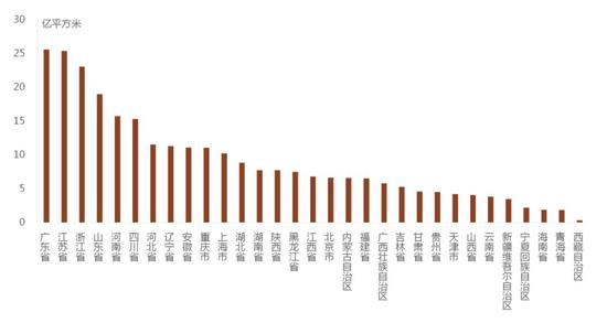 从各省份面积分布上看,广东省、江苏省和浙江省物业管理面积均超过20亿平方米,分别为25.6亿平方米、25.4亿平方米、21.6亿平方米。山东省、河南省、四川省、河北省、辽宁省、安徽省、重庆市、上海市物业管理面积均超过10亿平方米。