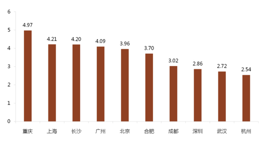 同时,500强加强对重点城市的深耕,在重庆、上海、长沙、广州、北京、合肥、成都等城市管理面积均超过3亿平方米,其中,重庆市的管理面积最大,达到4.97亿平方米,其他城市管理面积分别4.21亿平方米、4.20亿平方米和4.09亿平方米、3.96亿平方米、3.70亿平方米、3.02亿平方米。