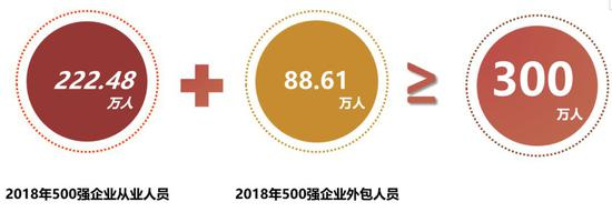 2018年,500强企业从业人员总数达222.48万人,外包人数为88.61万人,直接或间接提供就业岗位超三百万。