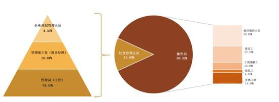 从人员岗位的分布上看,经营管理人员30.44万人,占从业人员总数的13.68%;其中企业高层管理人员占4.33%,管理处主任(项目经理)占20.81%,管理员(主管)占74.85%,500强企业不断优化人才队伍,逐步呈现金字塔形,结构合理。