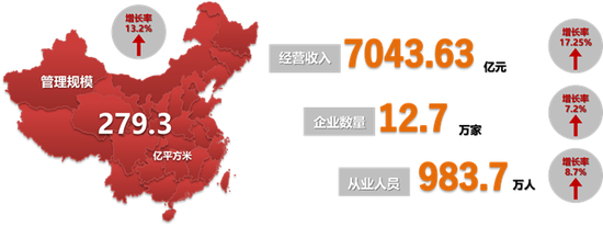 2018年底,全国物业管理行业管理面积279.3亿平方米,经营收入7043.63亿元,物业服务企业数量12.7万家,从业人员数量983.7万人。