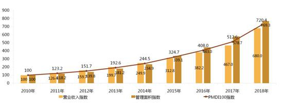 以2010年PMDI100指数基期值为100点,2018年PMDI 100指数达到720.4点,指数复合增长率达28.00%。从物业服务企业发展指数来看,我国物业服务企业综合实力稳步提升,在管理规模、经营绩效、服务质量等多方面均取得明显的成效。