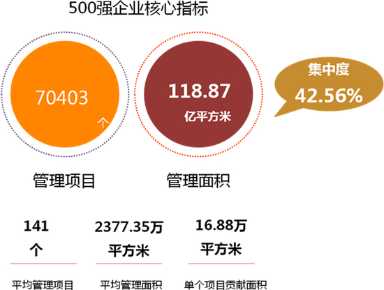 得益于政策、关联房地产公司的支持、企业市场化拓展能力的增强及资本市场的助推,500强物业服务企业积极推进全国化布局,管理半径不断拓宽,管理规模快速提升。2018年500强企业物业管理项目70403个,管理面积118.87亿平方米,占2018年物业行业管理总面积的42.56%,市场集中率进一步提升。500强物业服务企业平均管理项目141个,平均管理面积2377.35万平方米,单个项目贡献面积约16.88万平方米。