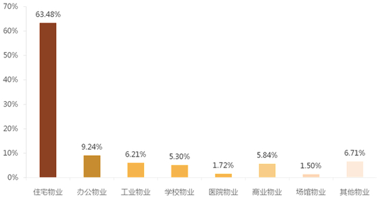 物业服务企业的管理业态全面拓展,发展势头强劲。2018年500强企业住宅物业管理项目34218个,管理面积75.46亿平方米,占比63.48%,处于物业管理业态的主导地位;办公物业、产业园区物业、商业物业三者的管理面积占比之和超过20%,为细分业态领域布局较为广泛的业态。此外,学校物业、医院物业、场馆物业和其他物业,管理面积分别占比5.30%、 1.72%、1.50%和 6.71%。