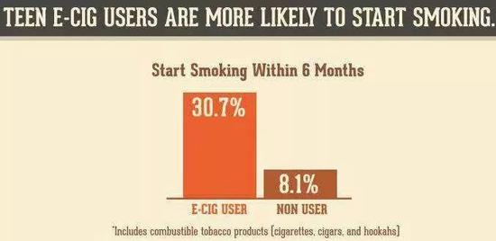 2016年2月,美国国家滥用药物研究所的调查显示:青少年吸食电子烟后,30.7%的人会在半年内开始吸食可燃烟草制品,包括常见的过滤嘴香烟、雪茄和水烟。在没有电子烟诱导的情况下,这个比例仅为8.1%。
