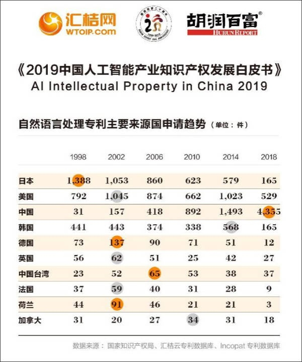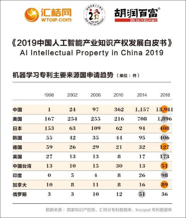 自然语言处理专利申请,1998年从31件专利申请到2018年的4355件。机器学习技术专利请,中国从1998年的1件到13941件。