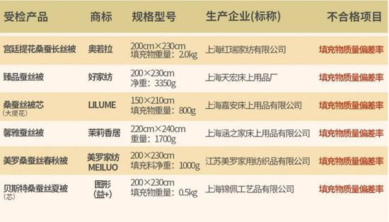 本次抽查中,有6批填充物质量偏差率不符合国家标准要求,不合格样品中,最大的偏差为-40.7%,有短斤缺两欺骗消费者嫌疑。包括:“奥若拉”宫廷提花桑蚕长丝被、“好家纺”臻品蚕丝被、“LILUME”桑蚕丝被芯(大提花)、“茉莉香居”馨雅蚕丝被、“美罗家纺 MEILUO”美罗桑蚕丝春秋被、“图形(益+)”贝斯特桑蚕丝夏被(芯)。