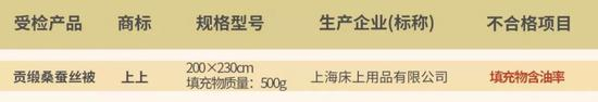 此外,含油率也是蚕丝被内在质量考核指标,如果含油率过高,丝绵容易变质而产生异味、变硬的情况,此次抽检“上上”贡缎桑蚕丝被含油率达不到标准要求。