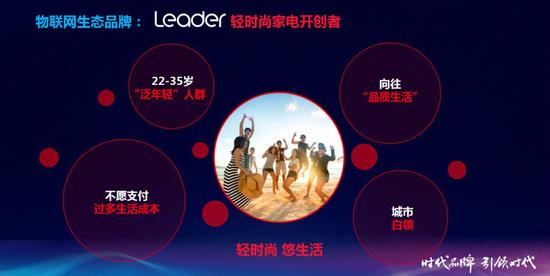 还有一个品牌,就是leader,主打轻时尚的家电,是轻时尚家电的开创者。主要锁定在22岁到35岁的泛年轻人群,这个人群的标签,是向往品质生活,同时又不愿意支付过多的生活成本,又是城市里的工作人员,刚投入工作时间不太长,有可能还没有成家。