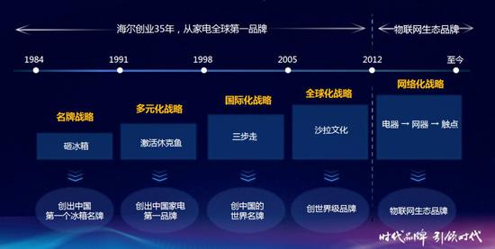 海尔从1984年开始创业到现在为止,总共经历了五个战略发展阶段:名牌战略、多元化战略、国际化战略、全球化战略以及正在进行的网络化战略。