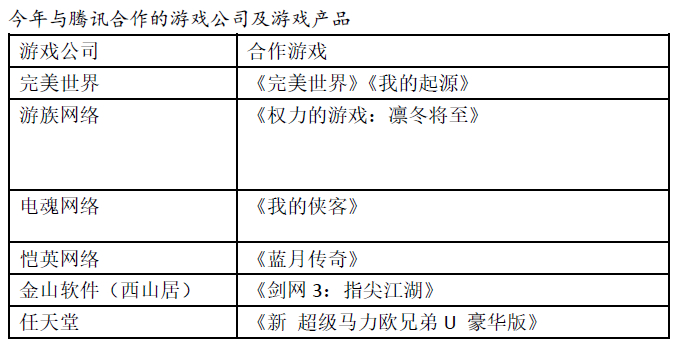 据记者的不完全统计,今年国内已至少有6家A股游戏公司宣布与腾讯达成合作,其中盛趣游戏(原盛大游戏)在11月与腾讯签署新的合作协议,双方约定,若盛趣游戏不自行发行和运营,在同等商业条件下,腾讯对盛趣游戏自有新游戏的简体中文版在中国大陆地区和若干指定境外地区的发行和运营享有独家优先合作权。