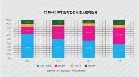 虽然从积极的一方面来说,市场经过近十年培育看似逐渐成熟,一个直观的表现是,会员收入开始超过广告收入,观众付费的意识已大幅提高。比如2018年,爱奇艺全年营收250亿元,在线广告营收为93亿元,会员服务营收为106亿元,分别占比37%和42%。广告收入占比从2015年的63.92%降至2018年的37%,会员收入占比则从2015年的18.7%增至2018年的42%。会员收入领先,广告收入退居二线。