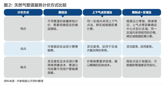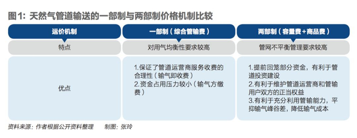 两部制价格也是国际通行方式——即由容量费和商品费构成。容量费的收取是基于用户对管输容量的合同需求,而与用户是否使用管道无关,管网公司用于回收固定成本,占大头的通常是管输费;商品费的收取则是基于用户的实际输气量,用于回收可变成本。输送气量越大,商品费越高。美国和英国的费率结构都由以上两部分构成,但是由于市场模式不同,美国的费率采用的是“点到点”法,而英国则采用“入口/出口”法。