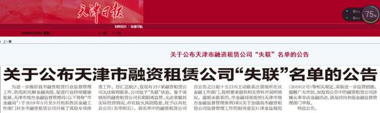 天津金融局公布首份融资租赁失联名单 217家公司上榜