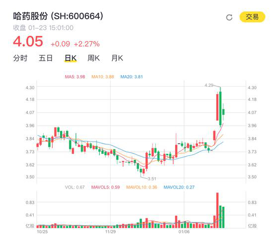 但在此前两天,1月20日、21日,受疫情影响,因哈药股份所属医药概念股,股价分别上涨4.55%、8.18%。