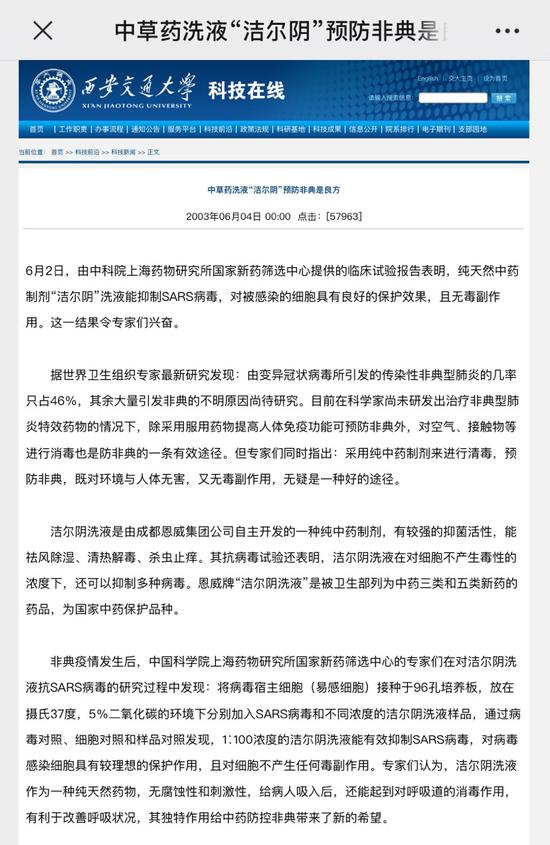 与此同时,据媒体报道,非典期间,上海药物所国家新药筛选中心提供的临床试验报告表明,纯天然中药制剂“洁尔阴”洗液能抑制SARS病毒,对被感染的细胞具有良好的保护效果。