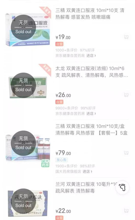 苏宁易购上,双黄连口服液也显示无货。