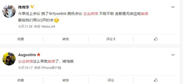 不过今日企业微信也出现崩溃。微博上,许多网友吐槽:“全国远程开工的第一天,企业微信的音频群聊,炸了… ”;“10点电话开会 企业微信电话功能直接给干爆了”;“前几天不说能300人会议吗,300人进入之后说不了话互相看头像吗?直播的弹幕能拉长吗能自动滚动播放吗???”