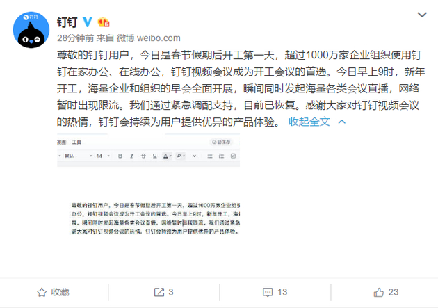 刚刚,钉钉在官方微博回应称,“今日是春节假期后开工第一天,超过1000万家企业组织使用钉钉在家办公、在线办公,钉钉视频会议成为开工会议的首选。今日早上9时,新年开工,海量企业和组织的早会全面开展,瞬间同时发起海量各类会议直播,网络暂时出现限流。我们通过紧急调配支持,目前已恢复。”