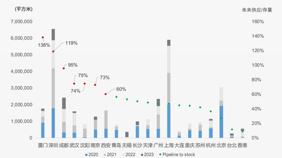 2019~2023年部分城市甲级写字楼供应量 数据来源:戴德梁行
