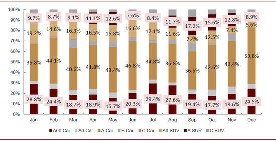 图表: 2019年纯电动车型销量比例,总体稳定,A00级轿车在低位波动