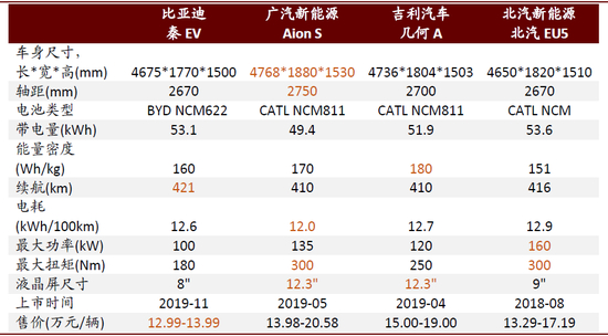新能源汽车的产品端在2019年呈现稳步提升态势。改款车型中,提质降价成为主旋律。以比亚迪秦EV为例,新车外观、内饰均有改进,并且NEDC续航提升21km至421km,但起售价格降低了2万元至12.99万元/辆。新车型中,AION S表现优秀,上市半年销量近3万辆。其在外观、内饰、空间、续航等方面较存量竞品均有提升,成为A级纯电动轿车新的样板车型。蔚来ES6则主打智能驾驶和用户体验,并通过与燃油车竞品差异化竞争,获得了高端消费者的认可,月均销量超过2000辆。