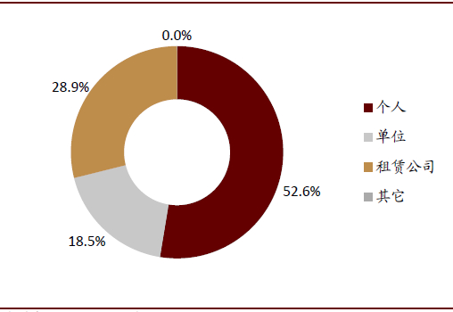 从所有权比例看,2019年新能源乘用车个人需求占比仅52.6%,而该比例在全部乘用车市场为90%以上。具体数据上,2019年个人、单位和租赁分别占到52.6%/18.5%/28.9%,较2018年的63.7%/16.8%/18.4%,个人需求占比下滑,租赁占比上升。